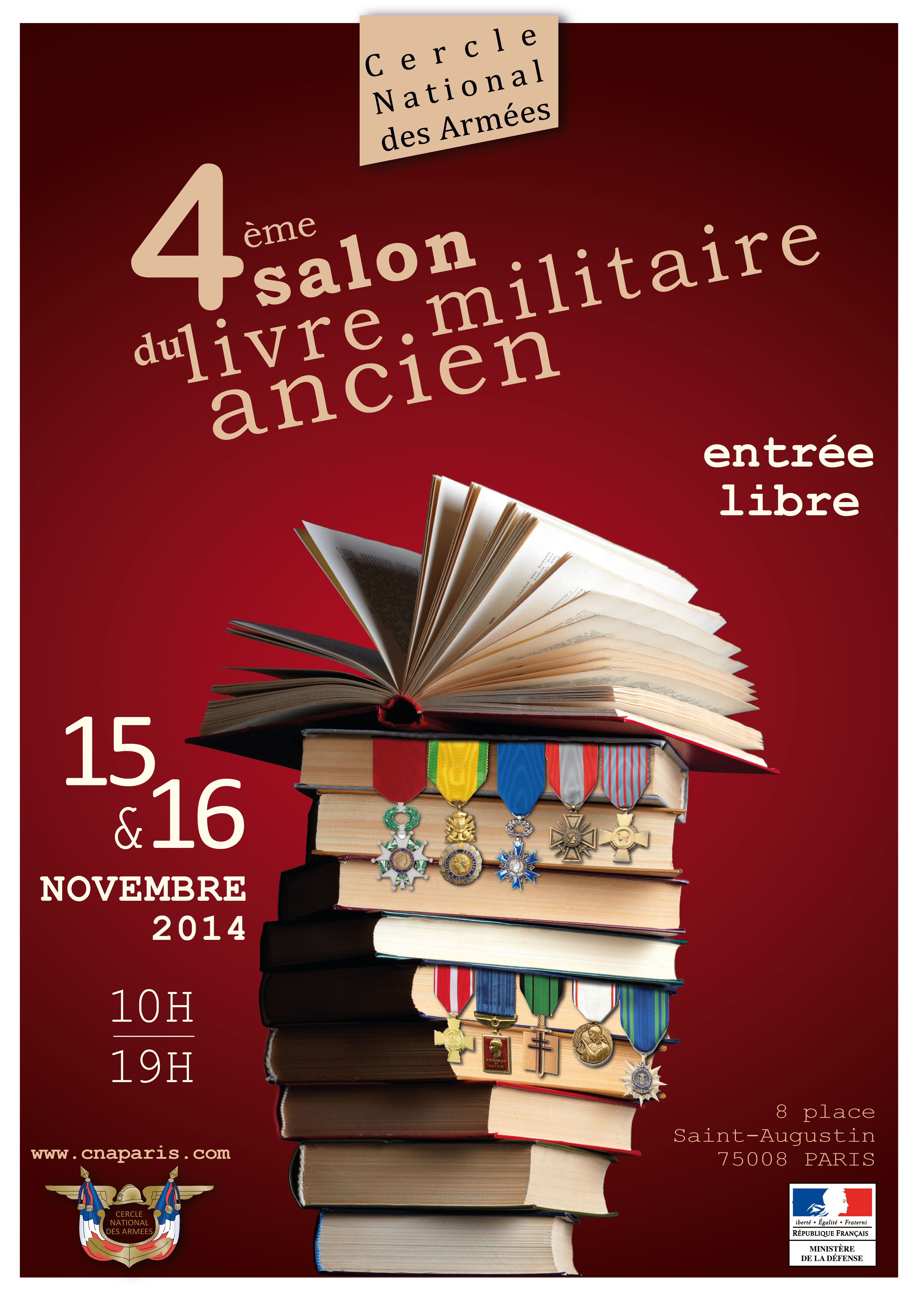L’amateur d’ouvrages militaires et de livres anciens, que je suis, ne peut pas ne pas signaler ce salon qui se tiendra les 15 et 16 novembre 2014, dans la salle des fêtes du Cercle National des Armées .