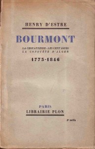 d’Estre fut l’un des rares biographes à s’intéresser à Bourmont. Il le fit en 1934 dans un petit opus de 281 pages que j’ai entre les mains depuis peu de temps. Une biographie classique qui vaut surtout par la rareté du sujet étudié. A noter les trois pages de sources en introduction de l’ouvrage fort utiles pour aller plus loin.