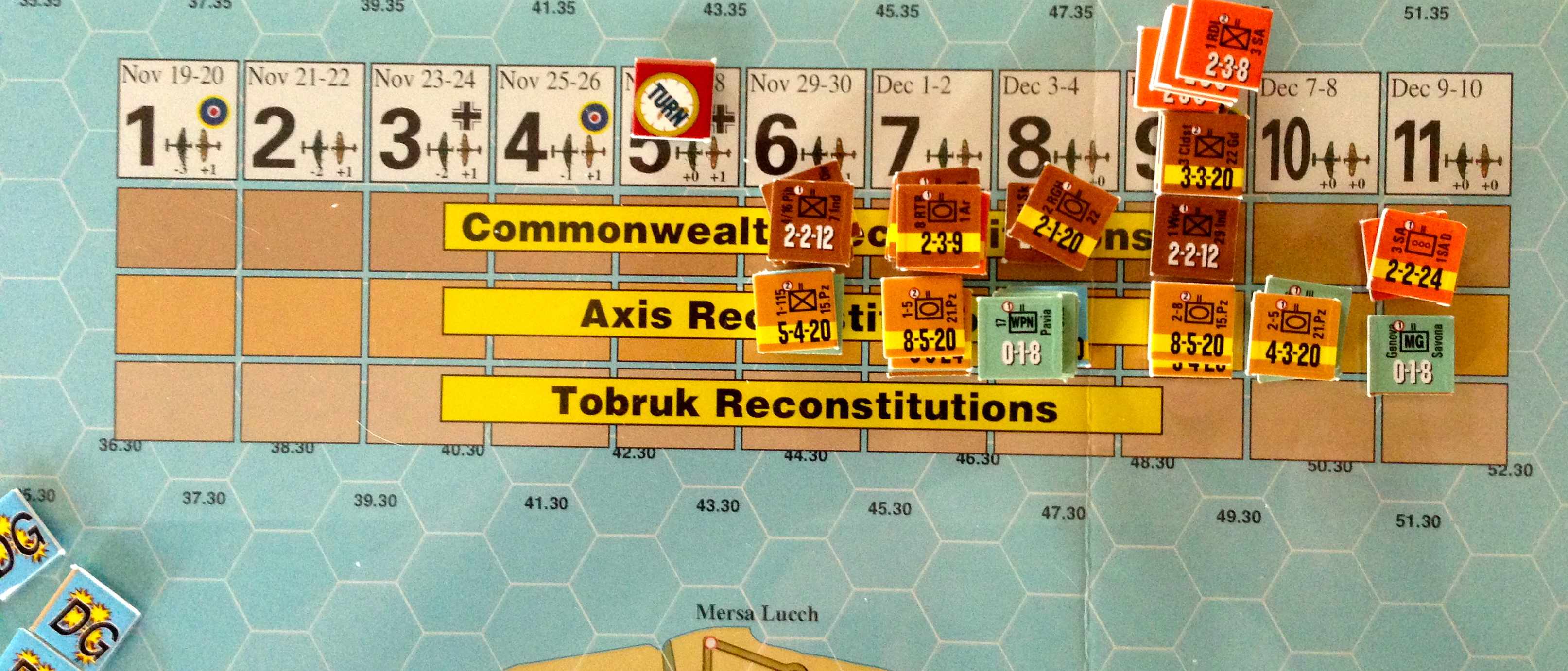 - la possibilité de reconstituer les unités éliminées (face réduite pour les Italiens et les Alliés, pleine force pour les Allemands)