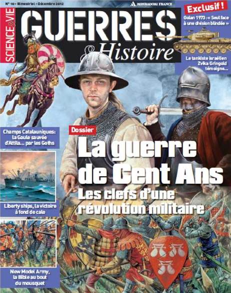 - La guerre de Cent Ans, les clefs d’une révolution militaire. Laurent Henninger a concocté ce dossier central. Pour lui, cette longue série de conflits caractérise un changement d’époque: on passe de la féodalité à des états aux armées organisées. La chevalerie laisse la place à l’infanterie et à l’artillerie. Une qualité de réflexion évidente.Les autres articles viennent éclairer le propos: cent ans et autant de guerres (Simon Galli), le grand arc, une arme de destruction massive (Laurent Pericone), la campagne de Jeanne, tournant du conflit (Philippe Contamine), sortir du Moyen Âge pour terminer la guerre (Benoist Bihan). On ne peut que souligner la pertinence des textes, la qualité des auteurs et une illustration très riche (cartes inédites et superbes illustrations de Giusseppe Rava). Guerres & Histoire maintient le standard de qualité très haut depuis le premier numéro.