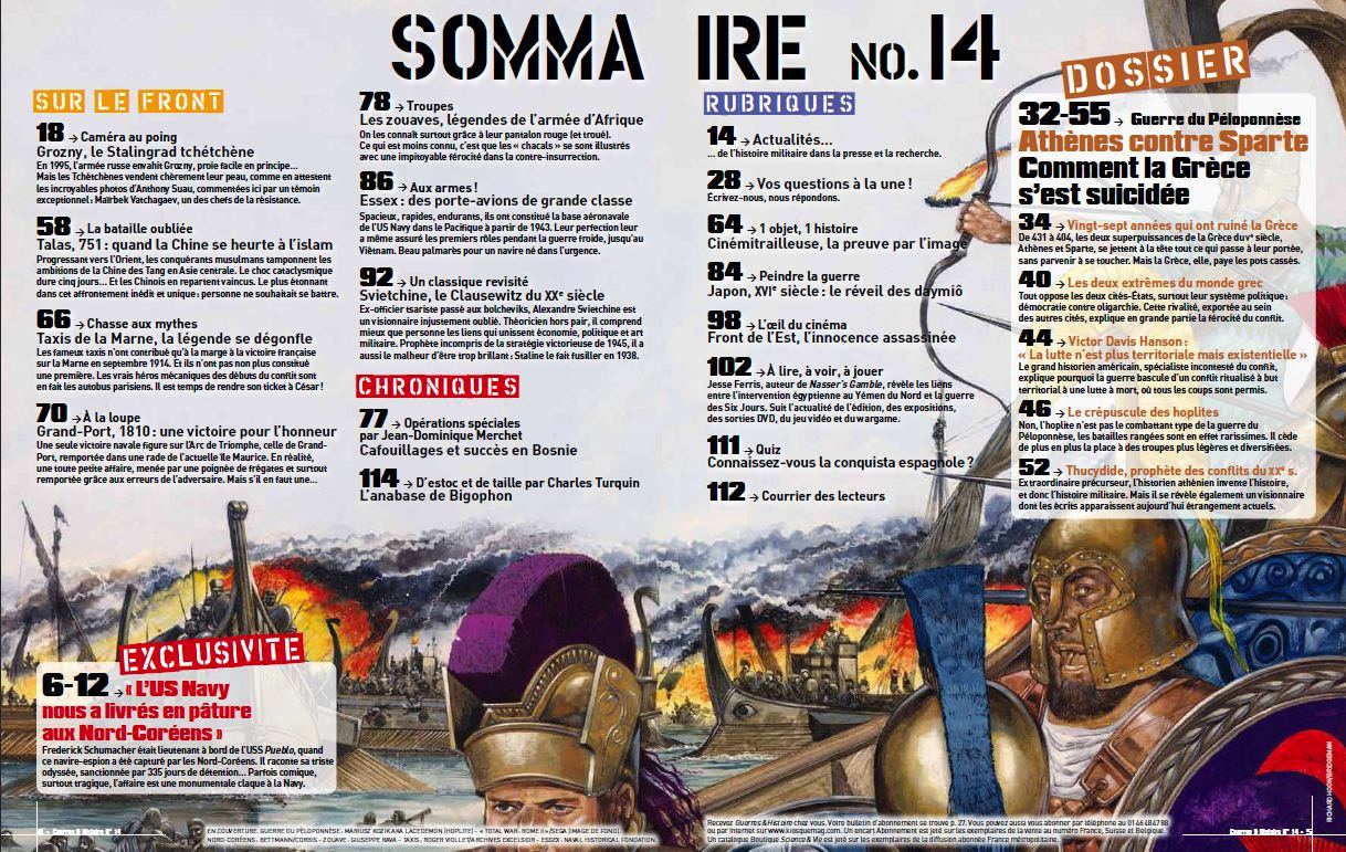 Et comme d’habitude une série d’articles accrocheurs comme le Pueblo en 1968, les zouaves, les taxis de la Marne (sans nul doute par Jean-Claude Delhez…), le CV Essex, le choc entre l’Islam et la Chine en 751 à Talas, Grosny et les rubriques habituelles.