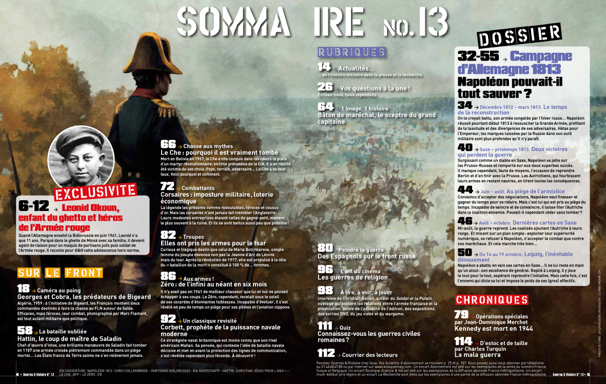 La campagne de 1813 en constitue le dossier central. Après le désastre de Russie en 1812, la Grande Armée devait se reconstituer alors que l’Europe entière se coalisait pour entrer en Allemagne. Batailles et jeux diplomatiques allaient marquer cette année décisive. Un bien bon choix éditorial de l’équipe de Jean Lopez !