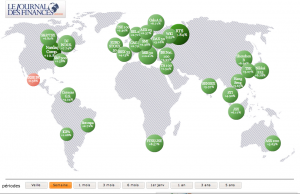 Le Journal des Finances actualise quotidiennement une carte dynamique des grandes bourses mondiales: