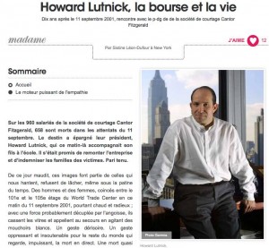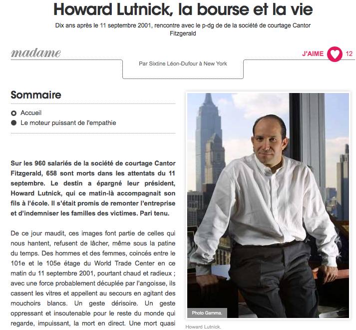 Le 11 septembre. Howard Lutnick, un destin, une vie. Géopolitique, Terrorisme, contre-terrorisme By jlsynave 22 janvier 2012 Tags: 11 septembre, 9-11, howard lutnik, terrorisme No Comments Le 11 septembre, des femmes et des hommes sont morts. D’autres ont vu leur vie changer. A lire dans Le Figaro. Tweet Partager