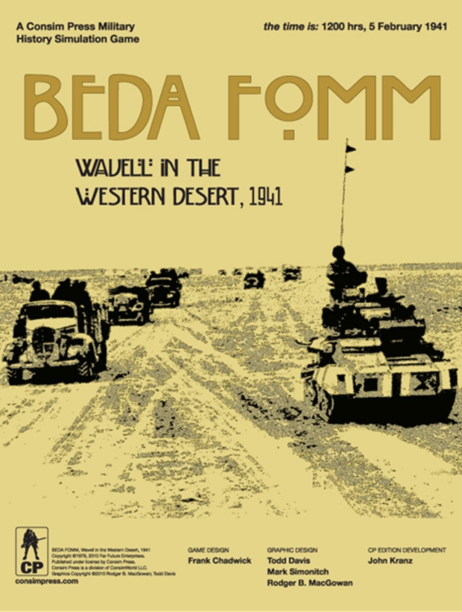 - Beda Fomm de Franck Chadwick. Je n’ai pas pu résister à acquérir ce grand classique du wargame par un des auteurs les plus importants de la discipline: Franc Chadwick. Initialement publié par GDW en 1979, le jeu vient d’être réédité par la jeune société ConsimPress en 2010. Une très belle réédition aux standards d’aujourd’hui pour un grand jeu ! A souligner que François-Xavier Euzet lui a consacré un très intéressant compte rendu dans le Vae Victis 96 et que David Hughes en a fait une analyse précise dans le Battles Magazine n°5. Plébiscité, donc !
