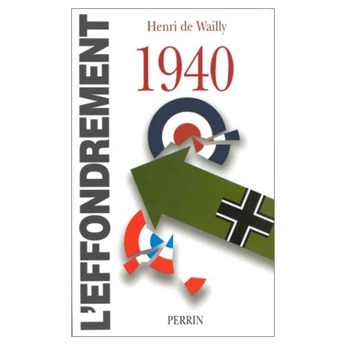 - 1940, l’effondrement d’Henri de Wailly. J’apprécie particulièrement les ouvrages de cet auteur. Voir son excellent Syrie 1941, la guerre occultée. Cet ouvrage se concentre sur la débâcle militaire, administrative et morale de la France en Juin 1940. Aux éditions Perrin en 2000. Cet ouvrage-ci manquait à ma collection, et hop !