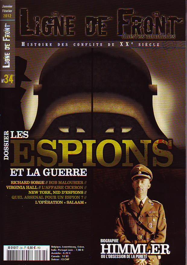 - Les espions et la guerre: renseignement et sabotage sont indispensables aux opérations militaires et constituent sans nul doute l’un des aspects les plus dangereux d’un conflit pour ceux qui exécutent ces missions. Ligne de front nous propose de découvrir les profils exceptionnels d’espions ayant œuvré dans tous les camps: Richard Sorge au profit des Soviétiques, Bob Maloubier et Virginia Hall au profit des Alliés et « Cicéron » pour son intérêt et l’Allemagne nazie. A la baguette, Philippe Richardot signe l’article sur Sorge (je pense que c’est une première pour le magazine, non ?), François Kersaudy signe les trois autres et de belle manière ! Trois articles de Xavier Tracol viennent compléter le dossier: les tentatives d’implanter des agents de l’Abwehr aux États-Unis, les armes des espions et l’opération Salaam, peu connue, pour implanter un réseau d’espionnage allemand au Caire. Les Allemands, visiblement, ont brillé au niveau amateurisme que ce soit aux USA ou en Égypte… Bon ok, l’affaire « Cicéron » n’est guère flatteuse non plus pour le Foreign Office et la sécurité britannique… 😉