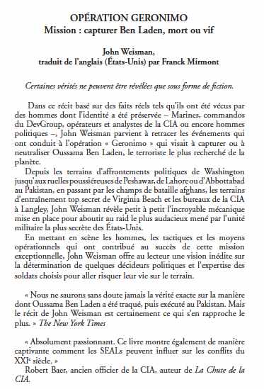 Chez Altipresse, il ne s’agit pas de Mission kill Bin Laden de Dalton Fury ? Pas sur l’Opération Geronimo à ma connaissance. Pour JD Merchet, il a dégainé le premier en effet mais c’est un petit opus basé sur une recherche documentaire. Le travail de Weisman est tout autre, il me semble ! On verra ! 😉