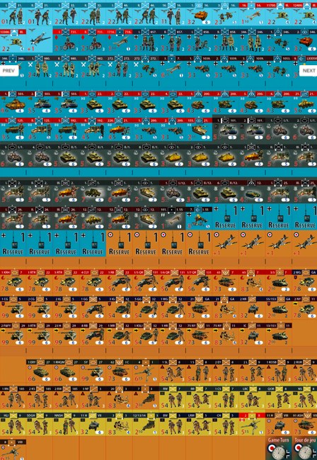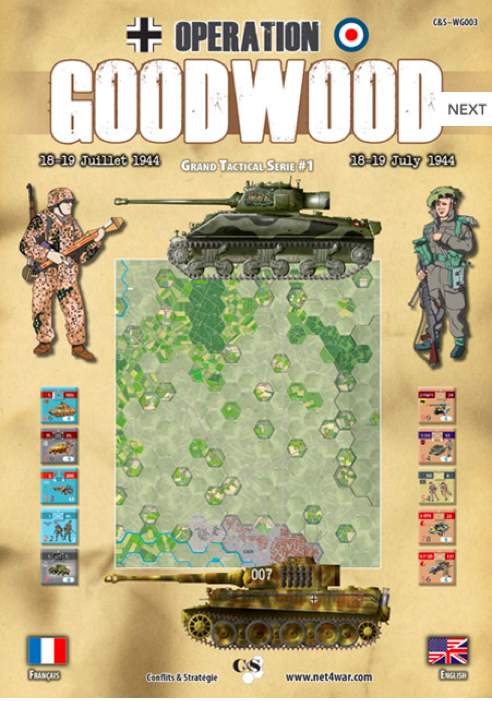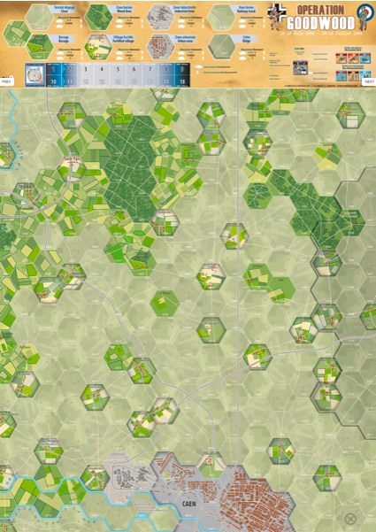 L’auteur est le même, Jean-Philippe Liardet, par ailleurs rédacteur en chef des magazines Champs de Bataille. Par contre, on constate un changement d’échelle avec « Opération Goodwood »: 1 km par hexagone, des tours d’ 1h30 et les unités au niveau bataillon/compagnie. La taille de la carte se rapproche furieusement des mini jeux du type Vae Victis avec un plateau de 15 x 17 hexagones… A voir… La carte me plait assez à ce qu’on peut en voir au niveau du design.