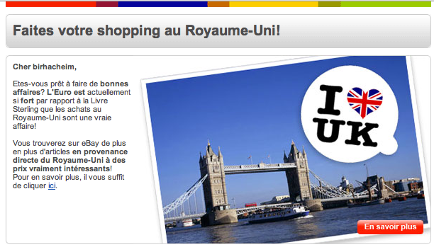 Pour faire faire de meilleures affaires aux acheteurs de la zone euro, eBay leur propose de profiter de la chute de la livre sterling britannique pour faire leurs achats auprès des vendeurs du Royaume Uni. Il fallait y penser: le malheur des uns peut faire le bonheur des autres !