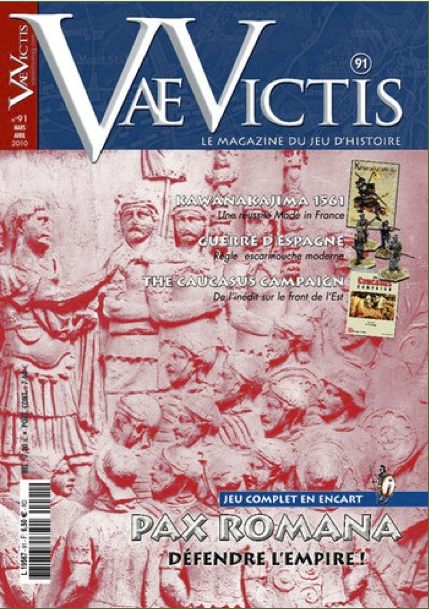 - Le jeu en encart: Pax Romana. Je m’excuse d’avance auprès de Stéphane Theillaumas. Mais là, on touche le fond de la régression… Un système conçu, je cite: »initialement comme un jeu coopératif pour permettre à des classes entières d’élèves de 6ème ou de cycle 3 de se familiariser avec la géographie et les problèmes de développement de la défense de l’empire romain… ». Bon, pourquoi pas ? 2 pages de règles, des pions on ne peut plus basiques, une carte jaune et bleue… bref… je zapperai celui là aussi… en attendant le Suez 1956 d’Amaury. J’espère… En fait, c’est toujours mon principal reproche à Vae Victis, un format de jeu ranplanplan qui ne laisse pas la possibilité aux concepteurs de s’exprimer. Je continue à penser que Battles Magazine a, quant à lui, trouvé le bon format DIRECTEMENT: 140 pions, 6 à 8 pages de règles, des composants de qualité. Exit les jeux en encart de Vae Victis ! Messieurs les concepteurs, proposez vos bons jeux à Battles Magazine, ils sauront les mettre en valeur ! Plus à Vae Victis !