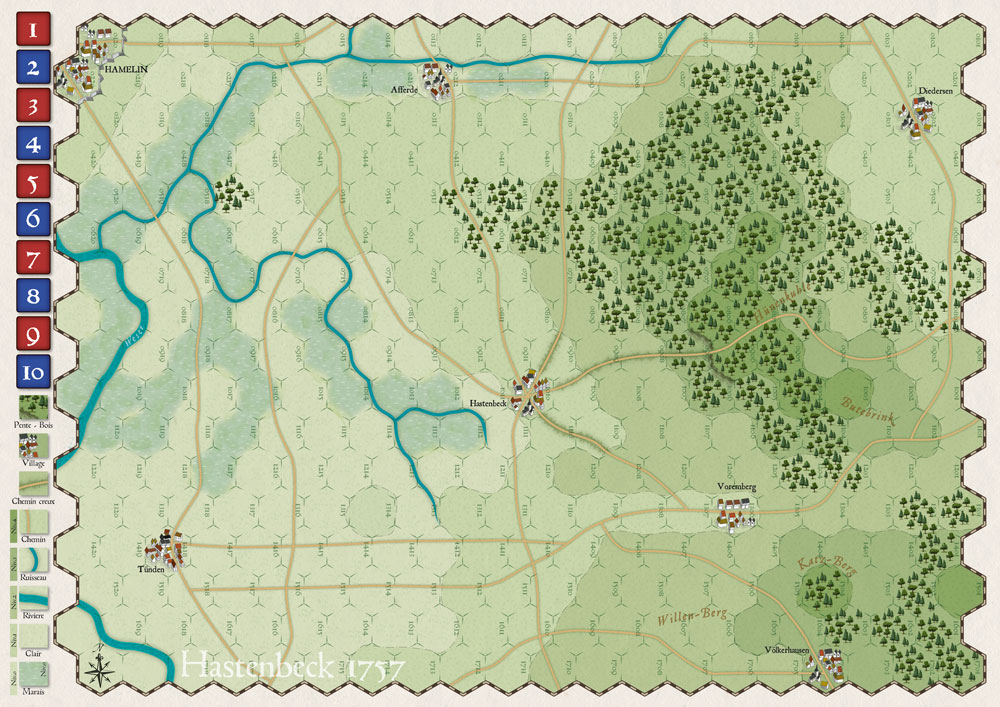 La carte me semble très pertinente, même si il manque peut-être quelques hexagones au sud (les Français vont être très proches du bord de carte) et je ne vois pas les redoutes alliées (peut-être simulées par des pions spéciaux ou inclues à de l’artillerie).
